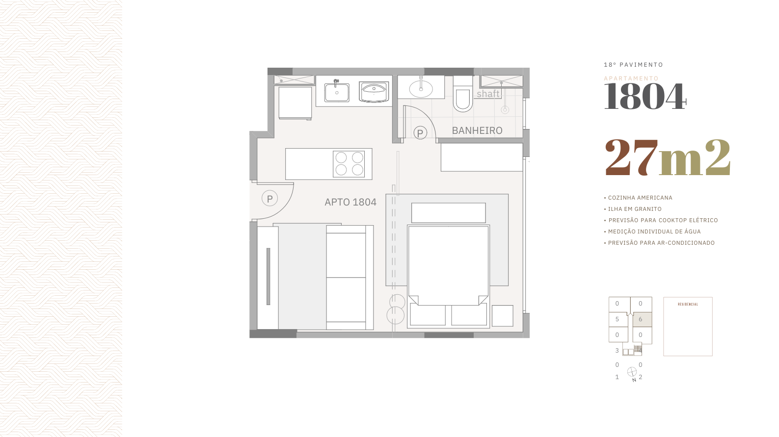 Studios que variam de 27m² a 89² com cozinha americana, ilha em granito, medição individual de água, previsão para ar-condicionado, opções com terraço privativo, coberturas duplex e garagem coberta.