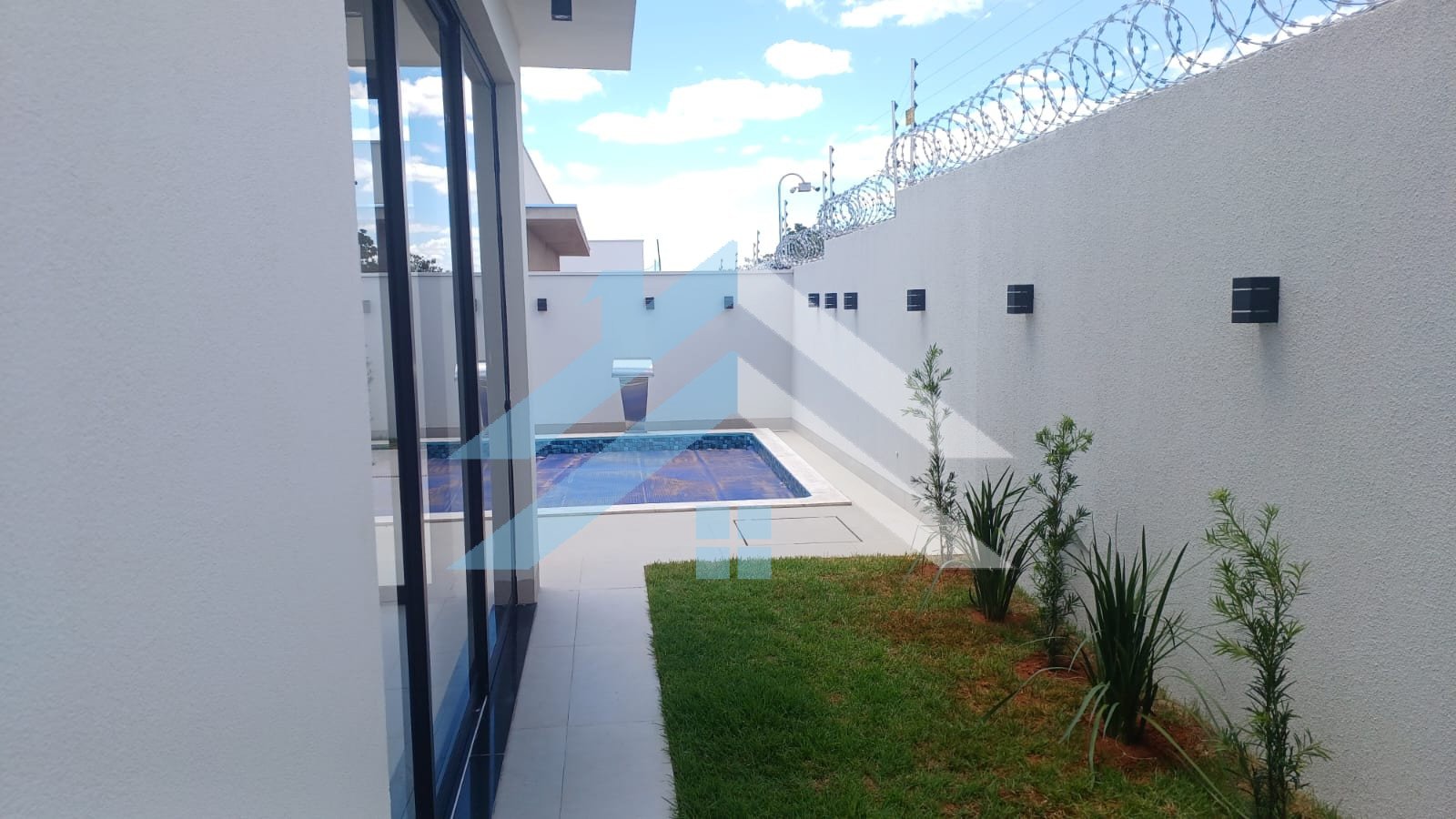 Área de laser com piscina, cascata, ducha e banheiro externo