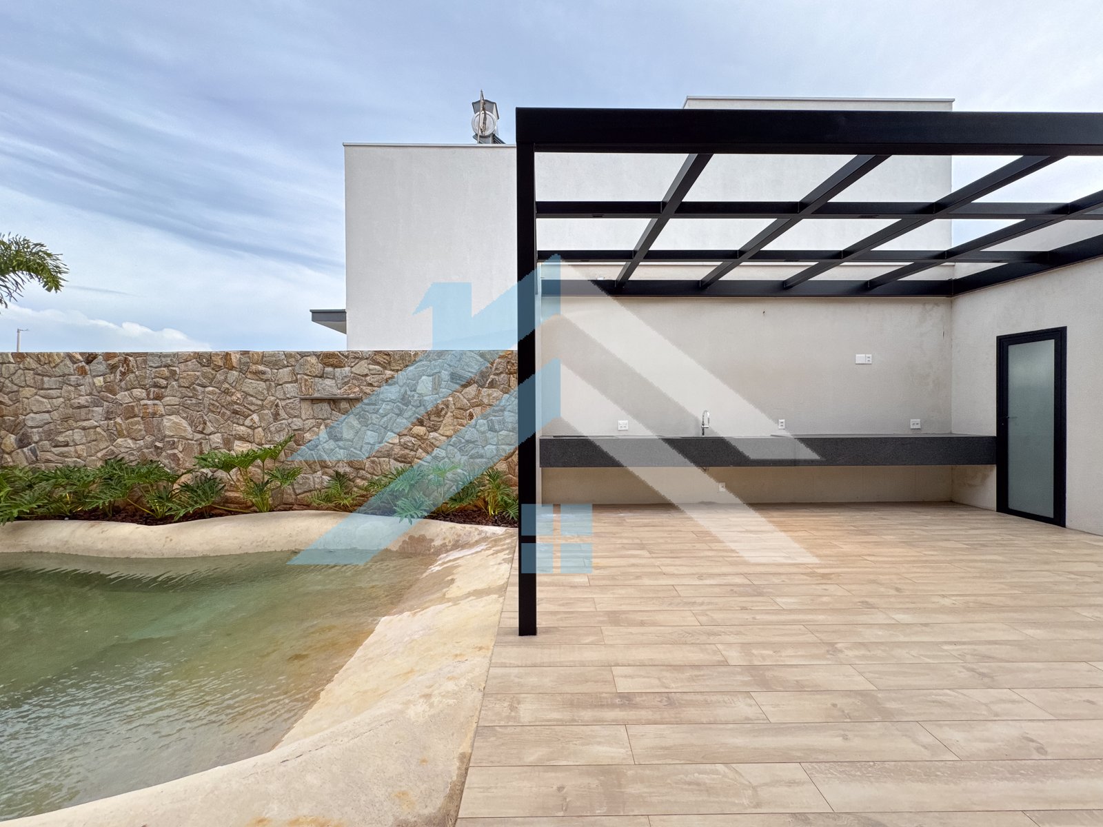 Piscina que é uma praia particular, em formato orgânico e feita sob medida, para uma casa única e exclusiva, com cascata, hidromassagem, aquecimento e iluminação. Junto a um deck gourmet com várias possibilidades.