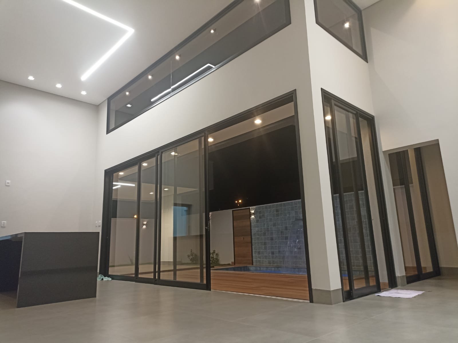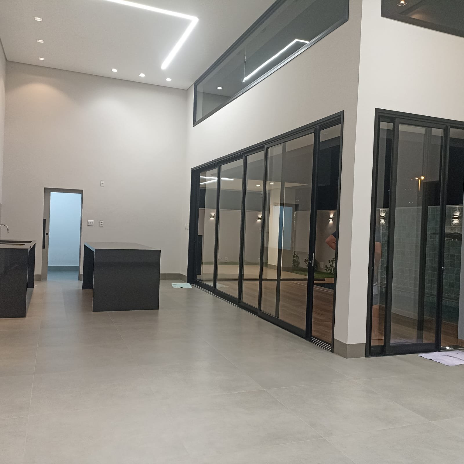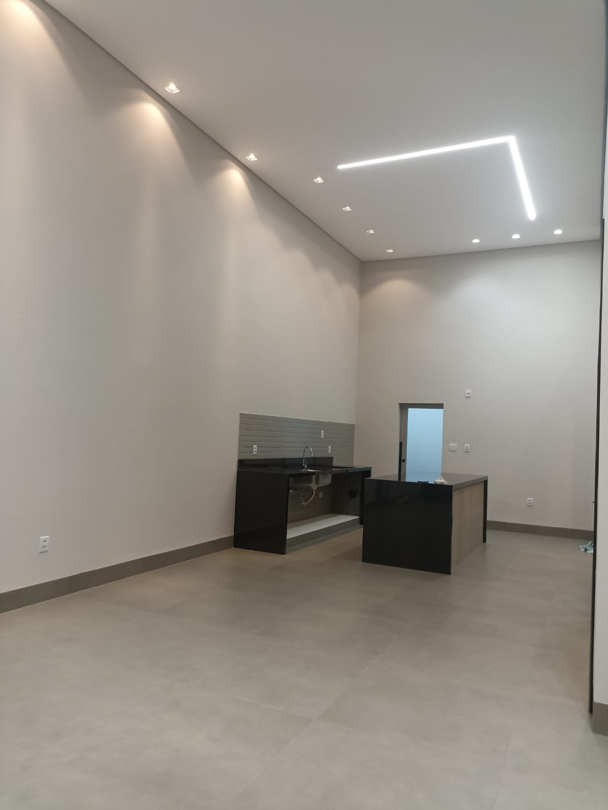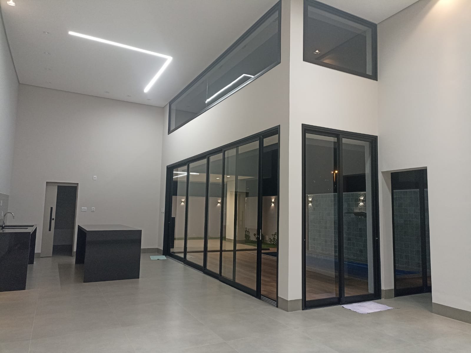 Sala ampla anexa a cozinha, ambas em pé direito duplo. Lavanderia, área goumert separada da cozinha. Banheiro externo para atender a área goumert.
