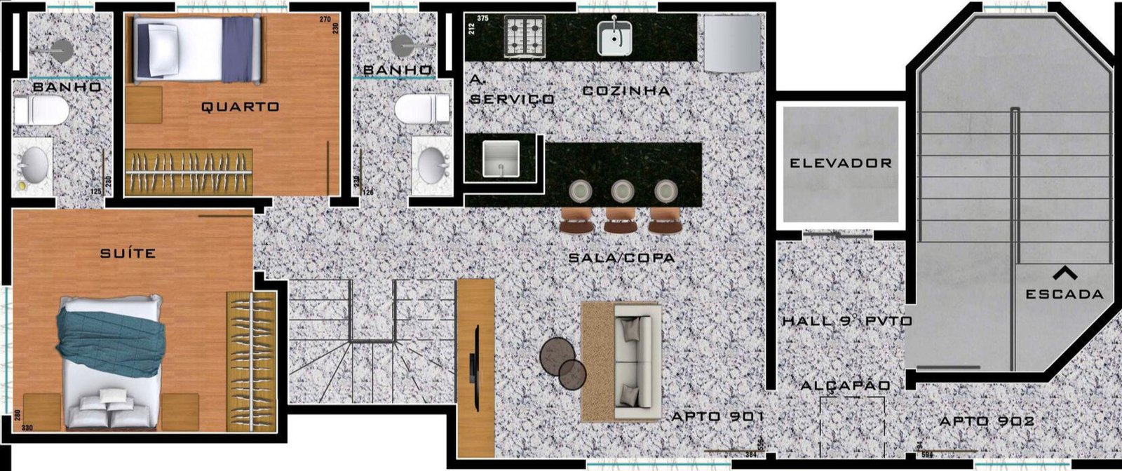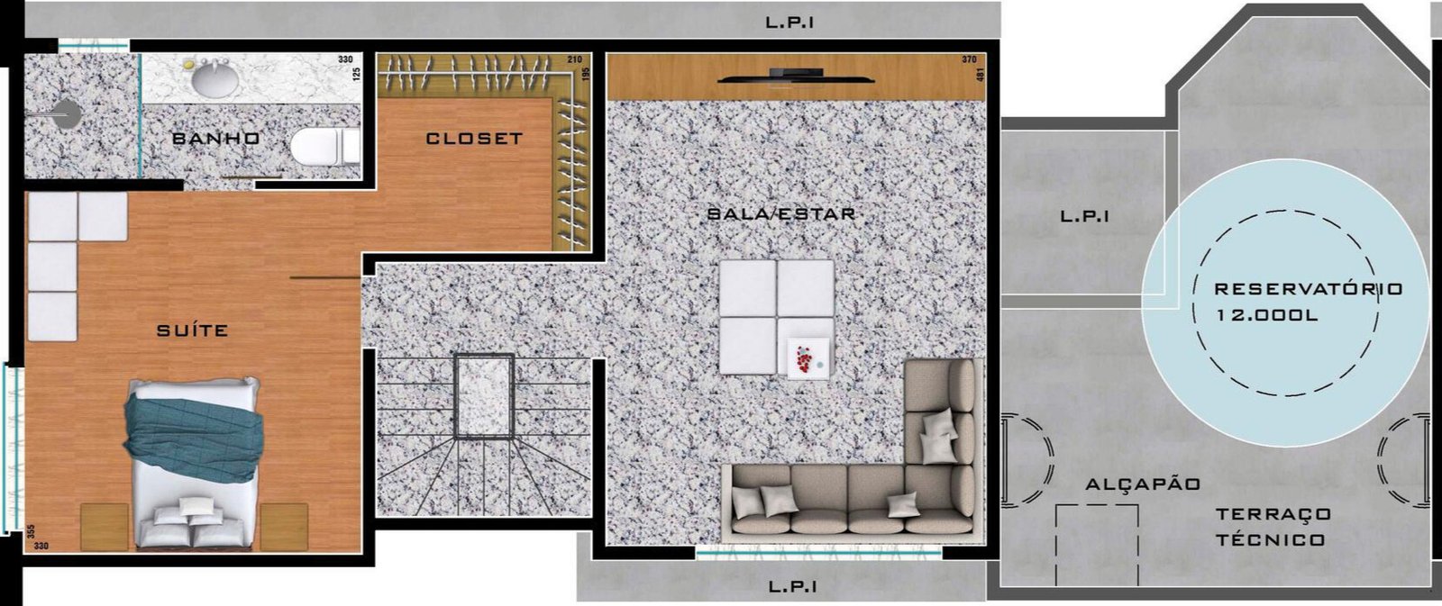 Cobertura triplex, sendo 1° nível com 56,5m², 2° nível com 51,6m², mais terraço descoberto de 31m².